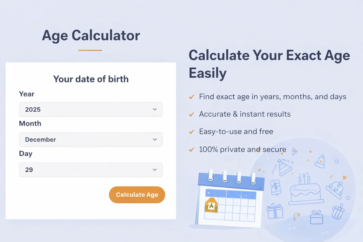 Calculate your exact age easily using this free online age calculator tool.